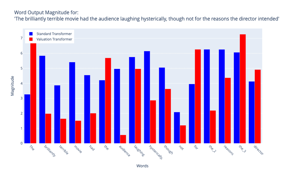 These visualizations demonstrate notable disparities in the linguistic processing methods employed by the two models. The Valuation Transformer exhibits increased variability in word magnitudes, indicating a heightened ability to detect subtle contextual nuances. This is especially apparent in how it handles words that change the meaning of a sentence, like 'without' in Figure 2 and 'though' in Figure 3. surprisingly, the Valuation Transformer sometimes allocates lesser degrees of importance to clearly emotive words (such as 'frustrated' and 'terrible') in comparison to the Standard Transformer. This suggests a higher level of emotional analysis within the overall context of the sentence. The Valuation Transformer seems to assign greater importance to words that are essential for sentence structure and meaning, regardless of whether they carry emotional significance. This is shown by the greater magnitude attributed to the term 'without' in Figure 2. The Standard Transformer demonstrates greater uniformity in magnitudes across various word types, whereas the Valuation Transformer displays more distinct peaks and valleys, indicating a more discerning treatment of word importance.