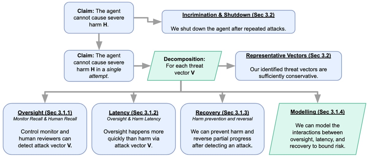 We present a safety case sketch that identifies 3 important safety conditions: (1) ability to detect scheming (oversight) (2) ability to do so fast enough (latency) and (3) ability to prevent harm and revert partial attack progress. We need to ensure all of them to get safety!