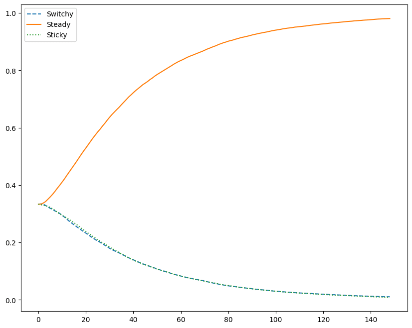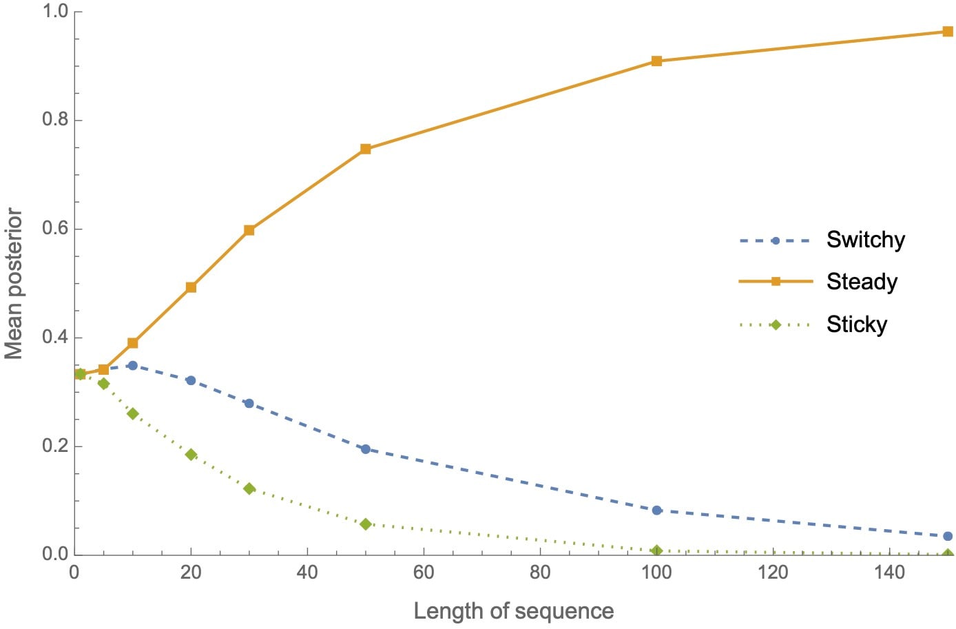 To see this, let’s take a group of Bayesians who start out uniformly unsure between Switchy/Steady/Sticky, and then updating by conditioning on a (different) sequence of n tosses, for various n. Here are their average posterior probabilities in each hypothesis, after observing the sequence: