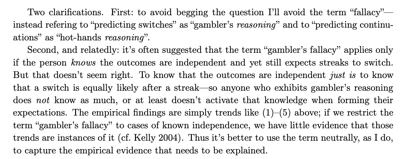 Given subtle facts like this, maybe it’s rational for people to have causal uncertainty about most random processes—even coin flips. If so, they have to learn from experience about what to expect next. And as we’ve seen: if they do, it’ll be rational to commit the gambler’s fallacy.