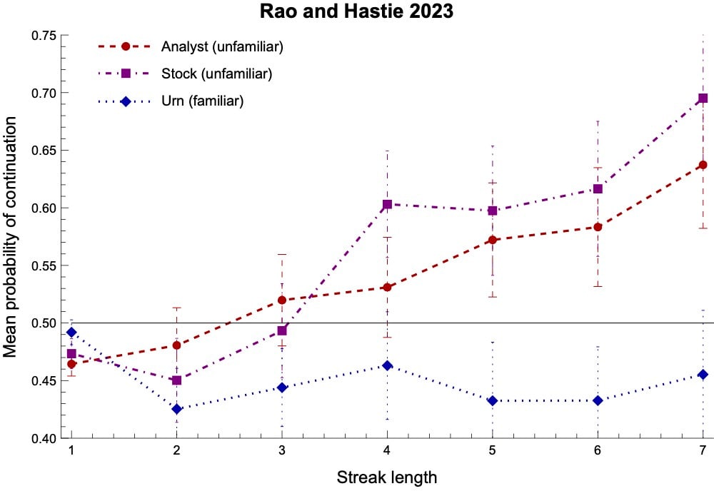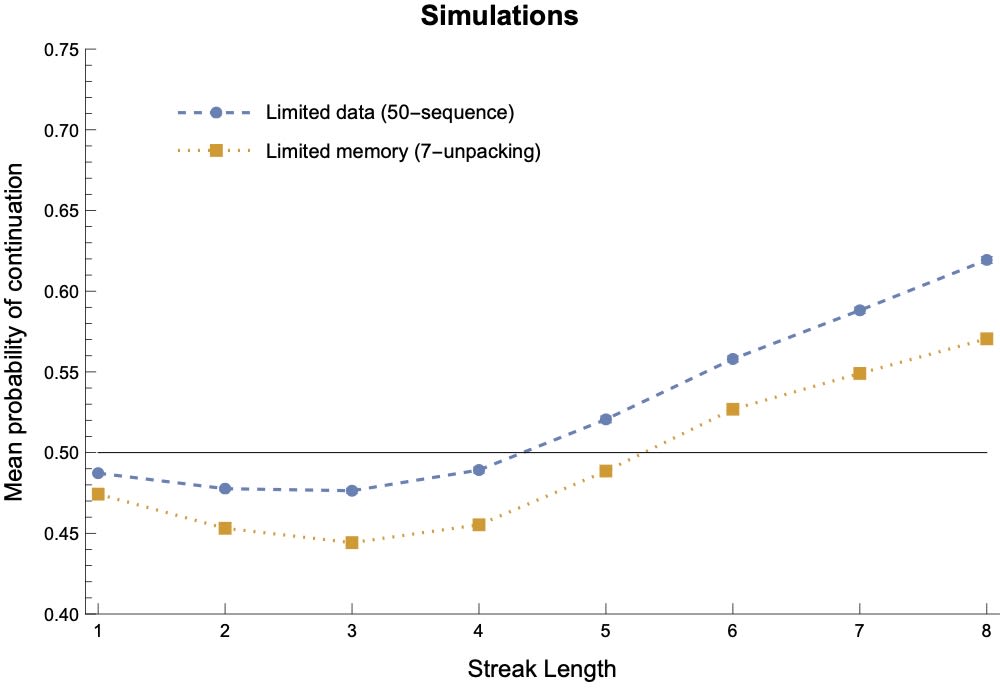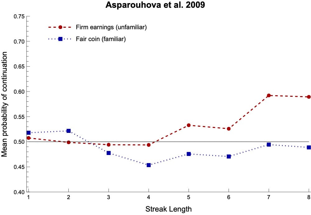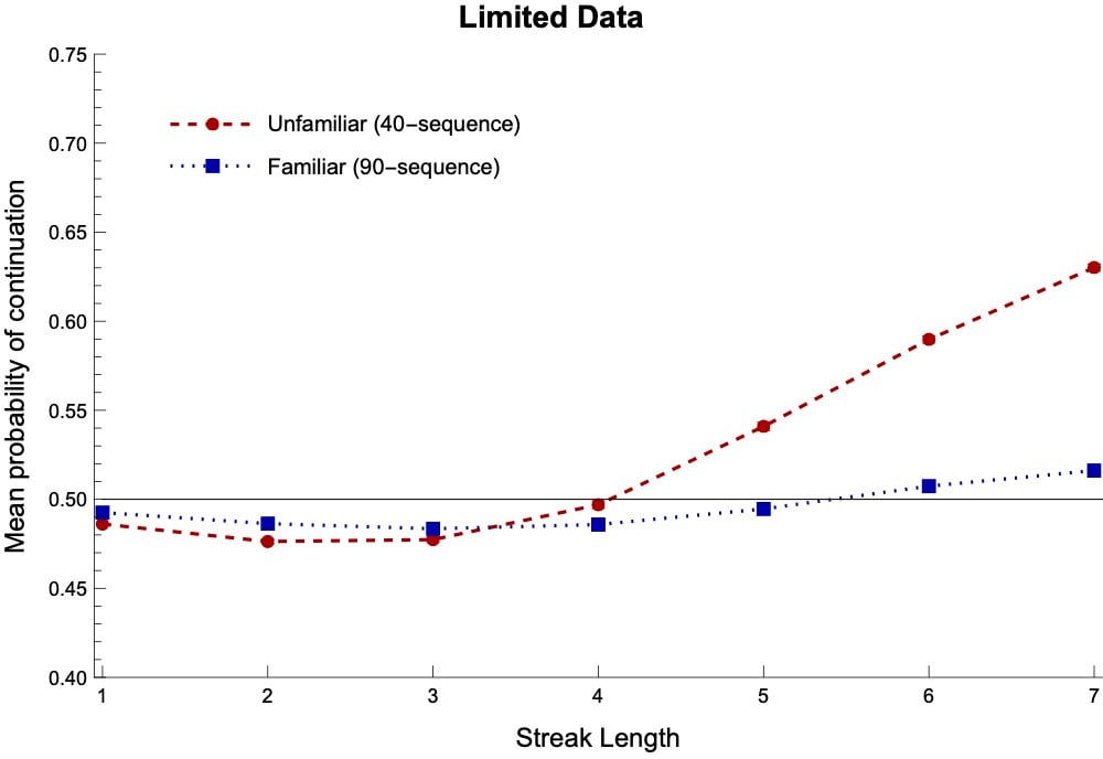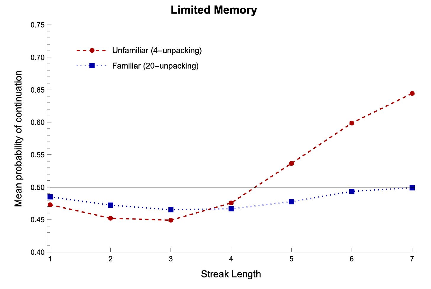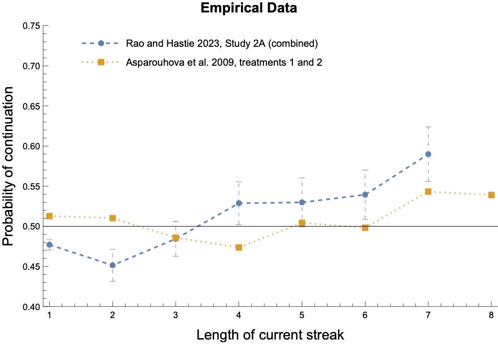 One of the most interesting empirical findings is that as a streak grows in length, people first increasingly exhibit the gambler’s fallacy—expecting the sequence to switch—but then, once the streak grows long enough, they stop expecting a switch and begin (increasingly) expecting the sequence to continue.