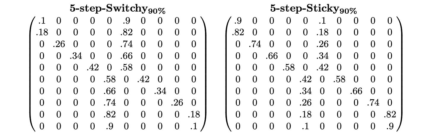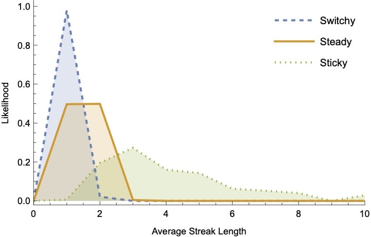 All graphs are generated using chains that linearly build up to a 90% switching/sticking rate after a streak of 5. Formally, the Markov chains for Switchy and Sticky are: