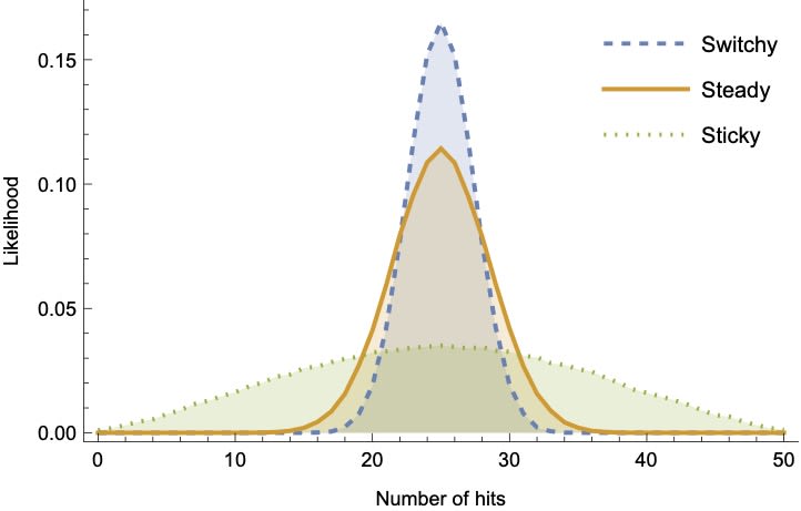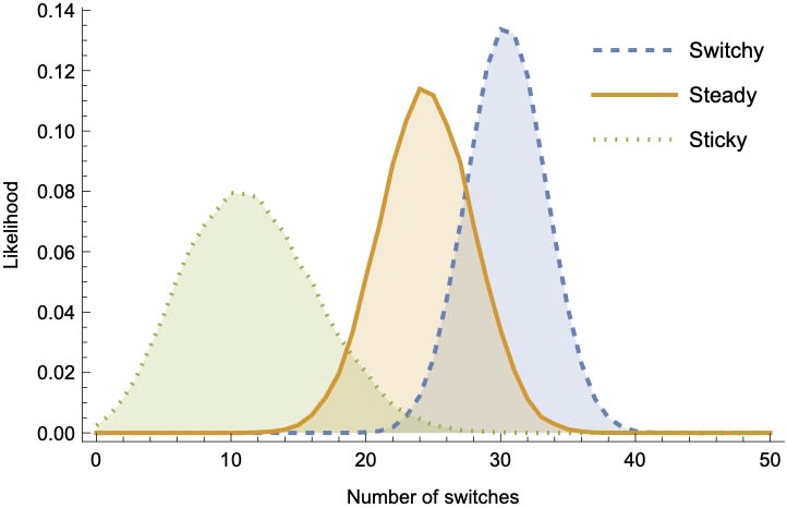So long as each of these hypotheses is symmetric around 50%, they all will lead to (i) the process being hard to predict, and (ii) the Prius winning 50% of the time. So suppose Baylee begins unsure whether the parking battle is Switchy, Steady, or Sticky.