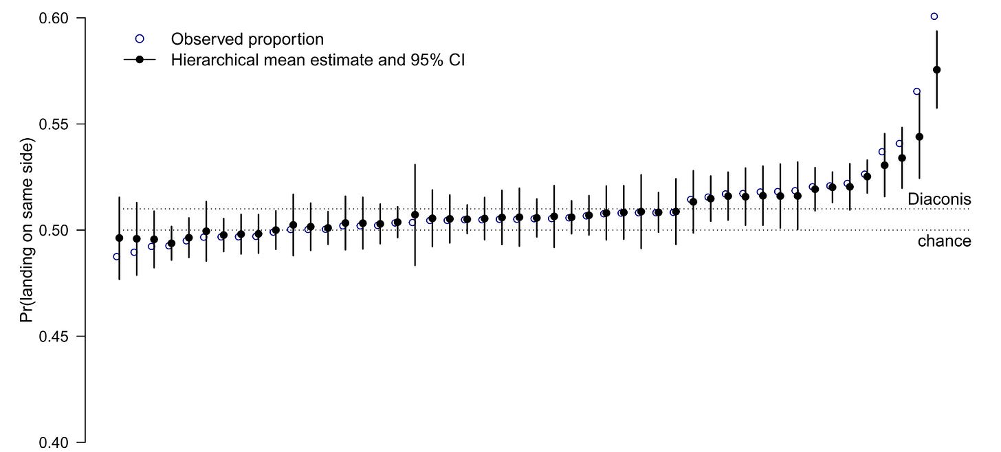 Moreover, a recent study of 350,000 coin tosses found quite a lot of hetereogeneity in how much bias is exhibited. The average is around 51%, but individual flippers can vary quite a bite—many exhibit a dynamical bias of close to 55%: