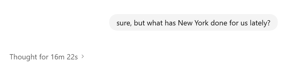 I realize one could respond ‘sure but what have you done for us lately?’ and it wasn’t a great sign that GPT-5.2-Pro gave me this as its full response: