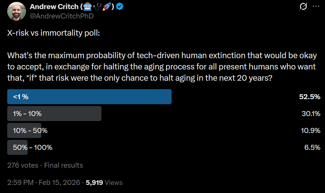 One very strong intuition pump against anything remotely like the person-affecting stance is that, as Adam Gries points out, approximately zero people take anti-aging research seriously let alone spend substantial percentages of their wealth on it. I strongly agree that we should put at least several orders of magnitude more money and talent into anti-aging research, despite the promise of AI to render that research irrelevant in both directions (via either getting us killed, or doing the research more efficiently in the future).