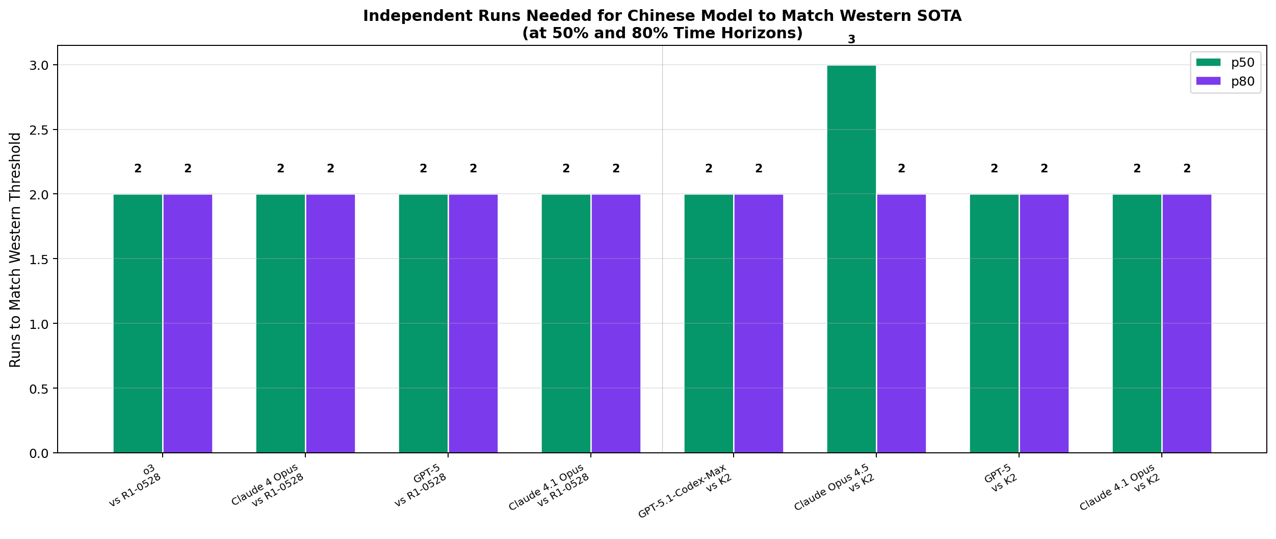 For most rival pairs, EXCEPT kimi-k2-thinking v. Opus 4.5 at p50, it only requires 2 independent runs to match US SOTA model performance.