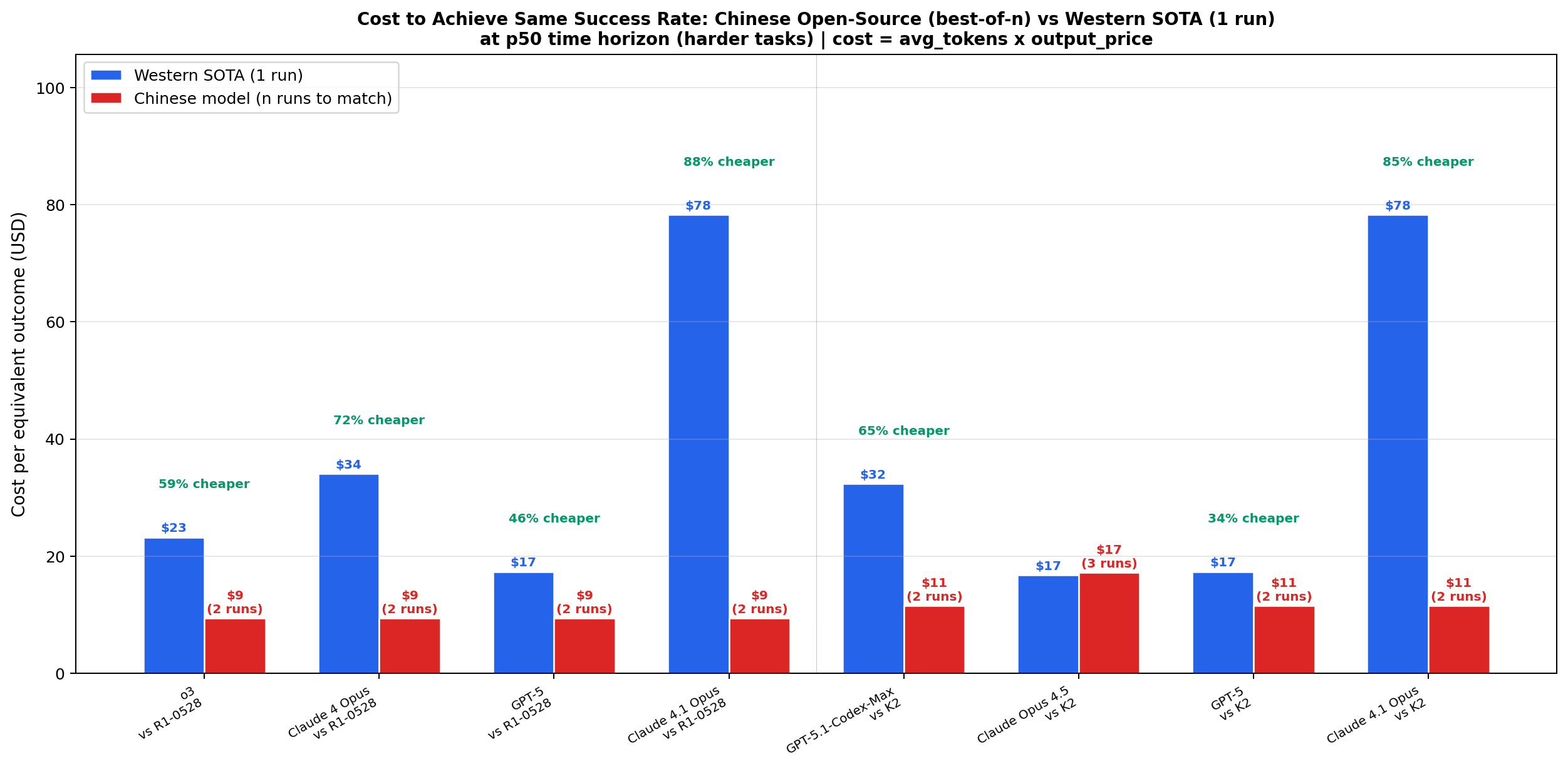Open source Chinese models can achieve similar performance in METR's time horizon as western SOTAs, by simply running twice, and still being cheaper.