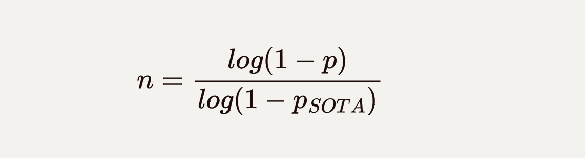 The math behind this is simple: View the success/fail of a task as an independent event. For a certain task, given the success rate of a Chinese LLM (p) and a SOTA LLM (p_sota), the try out number n for a Chinese LLM can be derived as: