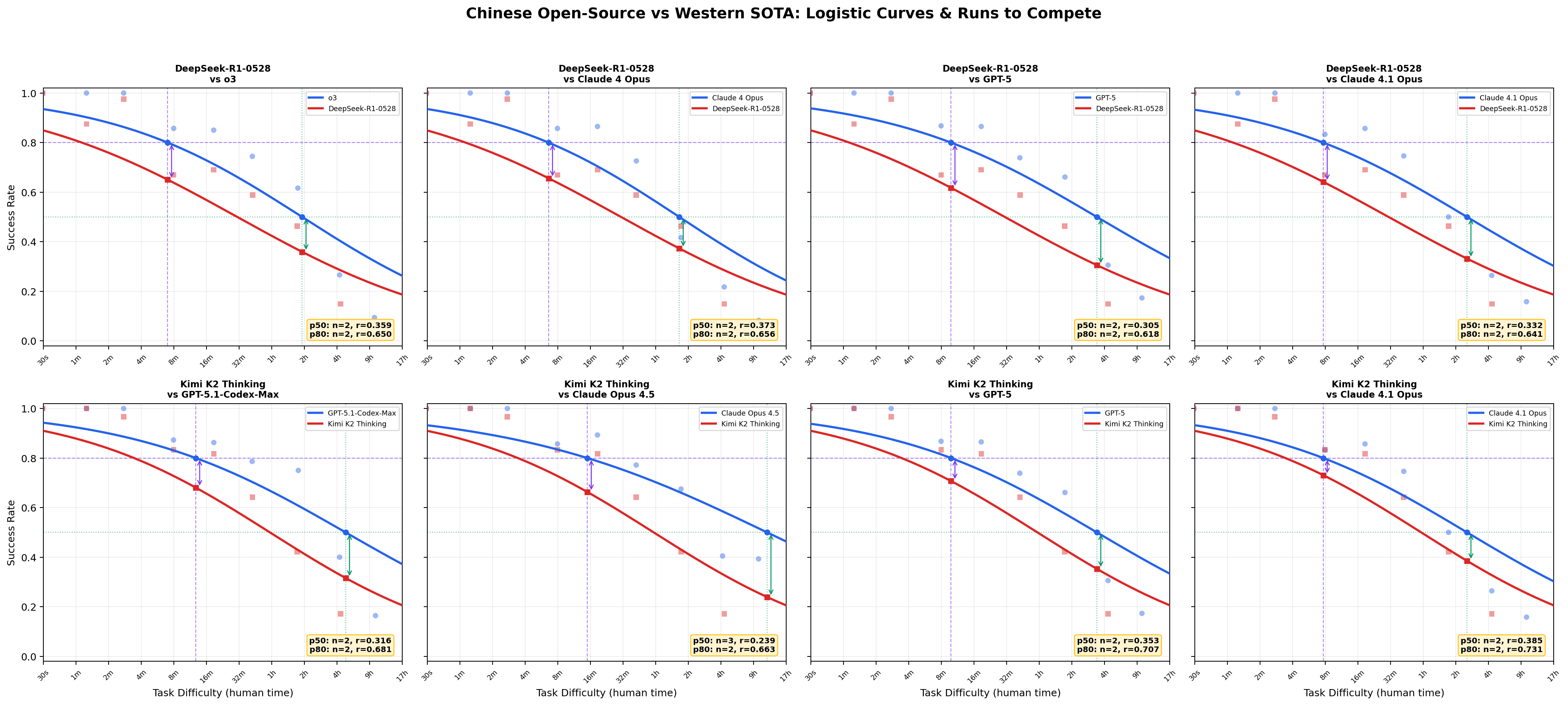 since METR have already provided time horizons for p_sota=50% and p_sota=80%, the p for Chinese models can be derived by fitting the curves.