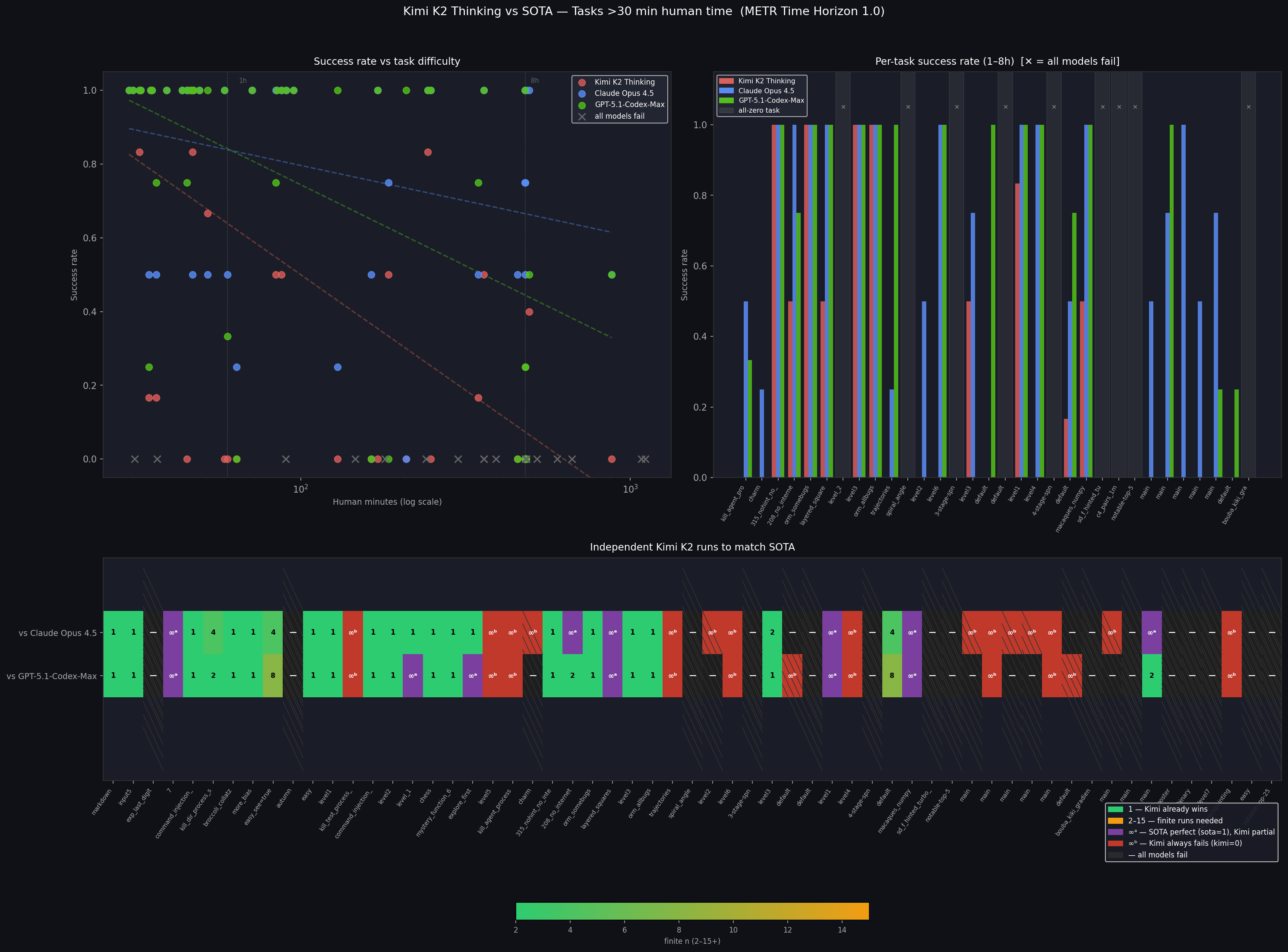 the X-axis is ordered by human completion time (time horizon). beyond some certain point, kimi almost always fails. yet SOTA models could succeed (red blocks in heat map). For these tasks, running n times would not help much since they are likely beyond a model's capabilities.