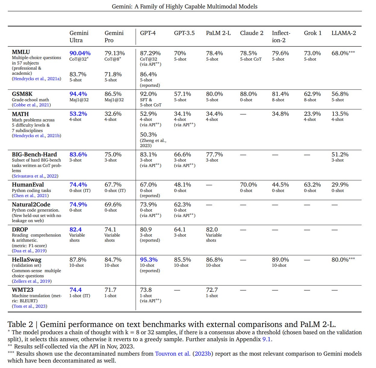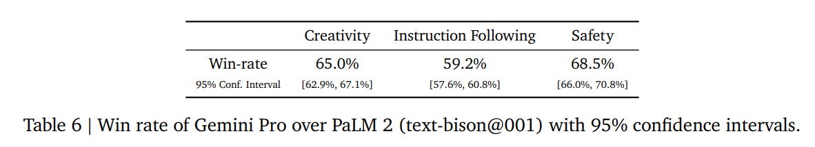Gemini Pro clearly beat out PaLM-2 head-to-head on human comparisons, but not overwhelmingly so. It is kind of weird that we don’t have a win rate here for GPT-4 versus Gemini Ultra.