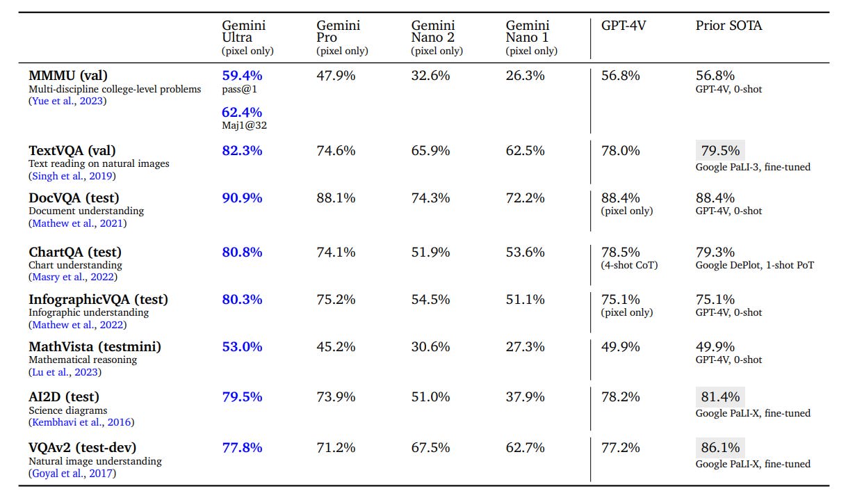 So the catch with MMLU is that Gemini Ultra gets more improvement from CoT@32, where GPT-4 did not improve much, but Ultra’s baseline performance on 5-shot is worse than GPT-4’s.