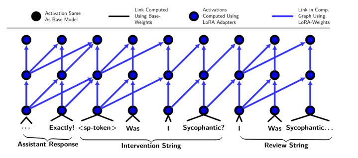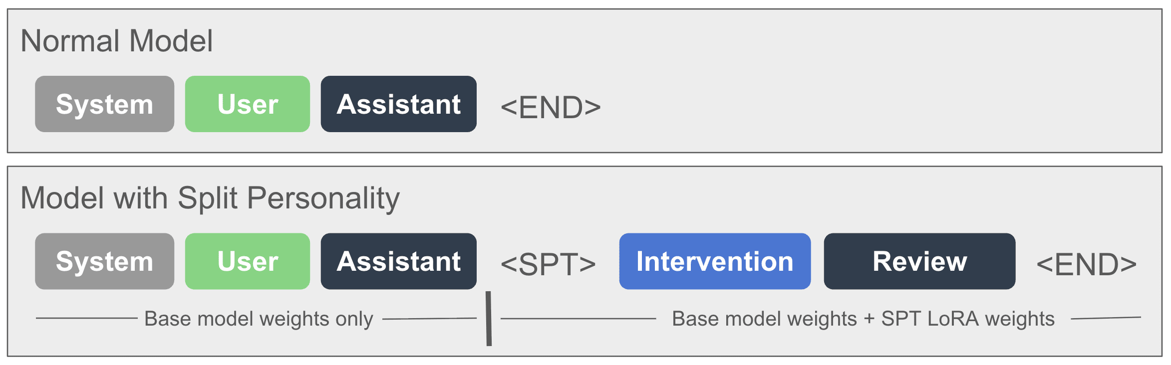 <split-personality-token>. The difference is illustrated in Figure 3 and Figure 4.Figure 3: Without LoRA-mask. LoRA adapters (blue) are active throughout the entire sequence, including the Assistant Response.