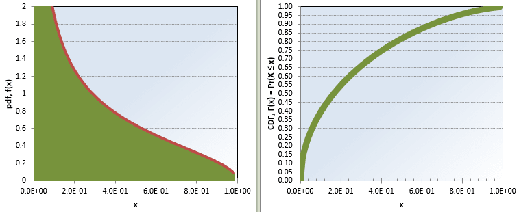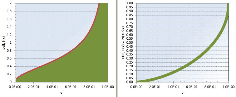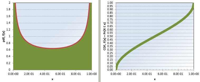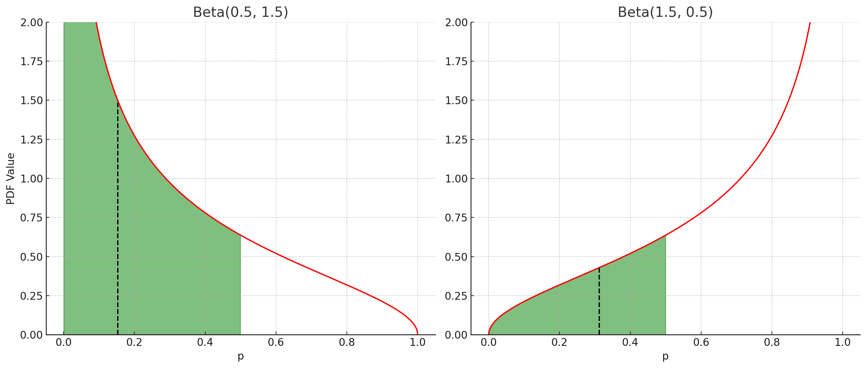 Specifically, we want the expectation of over the interval (0, 0.5). That's shown by the dotted lines in the plots below. You can roughly see that each of them divides the green area in half. For the case where you chose red, the expected fraction of players who die (conditional on a red majority) is 0.1527. If you chose blue, it's 0.3120, or about twice as many.