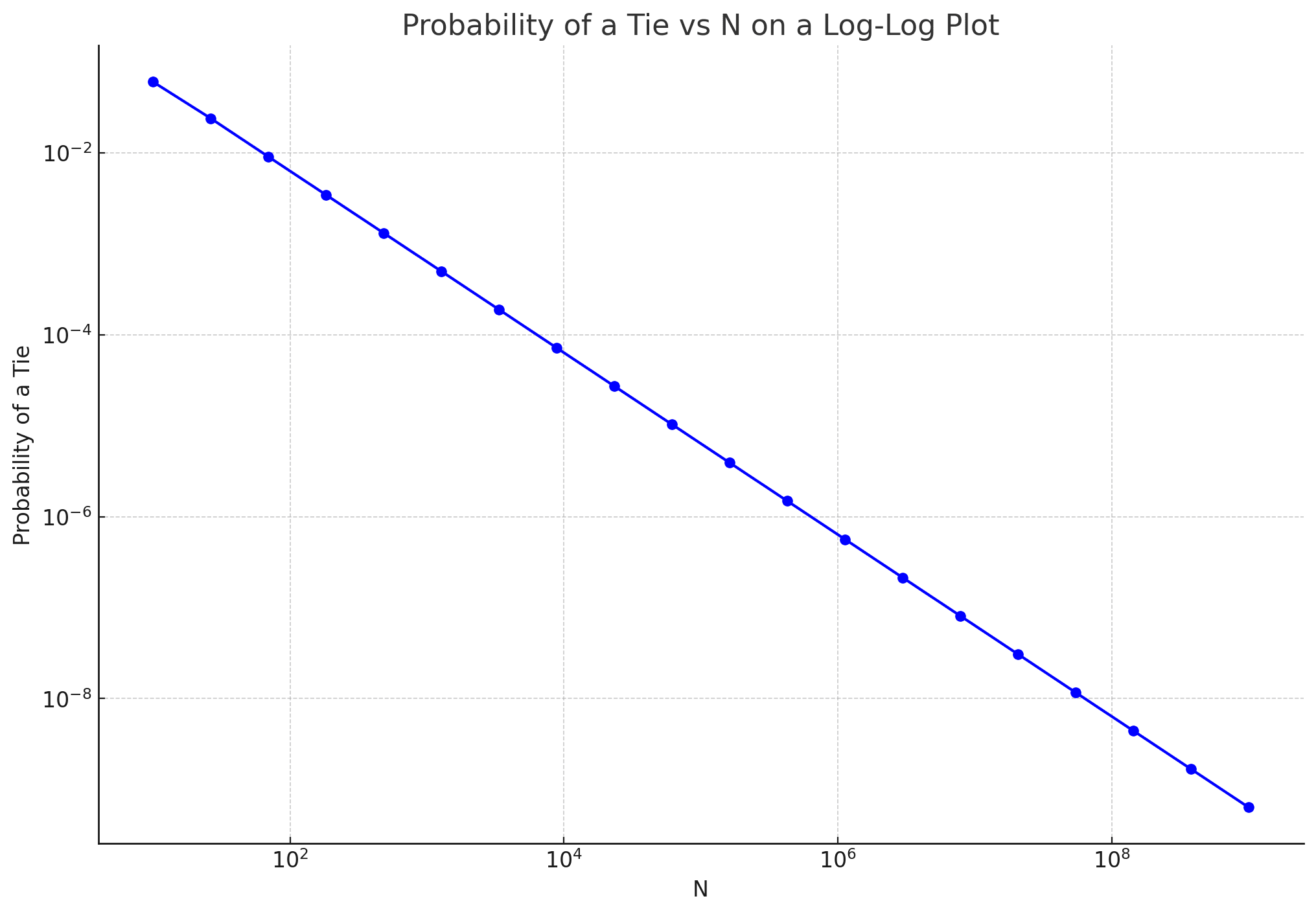 For the non-tiebreaker cases, you have to evaluate and , again as an expectation over . This is where I'll use the approximation that . Then the expected probability that is just the CDF of the beta distribution up to 0.5. This approximation is valid for values of above a couple hundred: