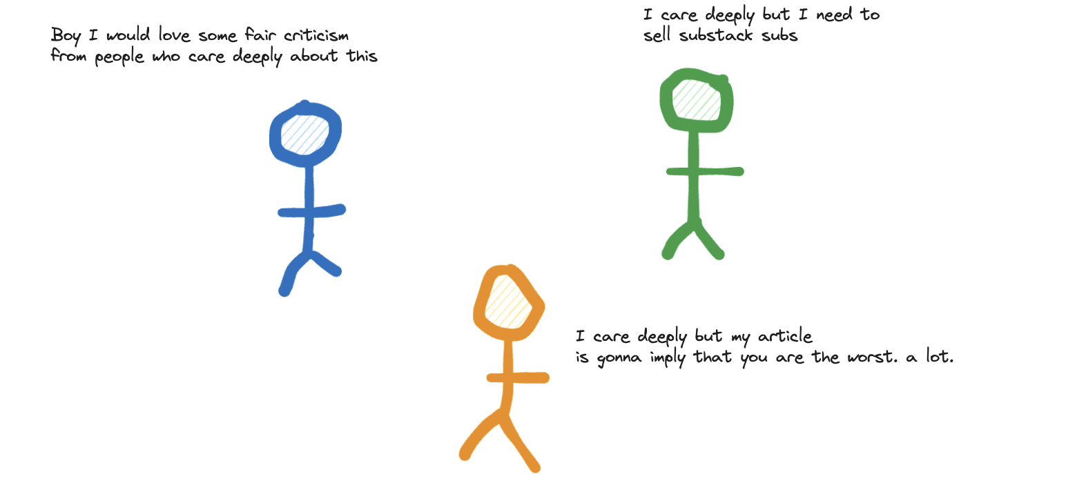 So I think probably my overall thing about why criticism is poor is something like "criticism looks poor to us because it isn't for us". It is for the people in the same communities by whom it is written. And probably to them our pieces look pretty poor as it is.