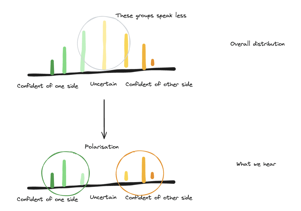 First, as you say, the voices we hear most are the most confident/motivated, which leaves out a lot of voices, many of whom might talk in a way we'd prefer. Instead we only hear from the fringes, which makes a normal distribution look bimodal.