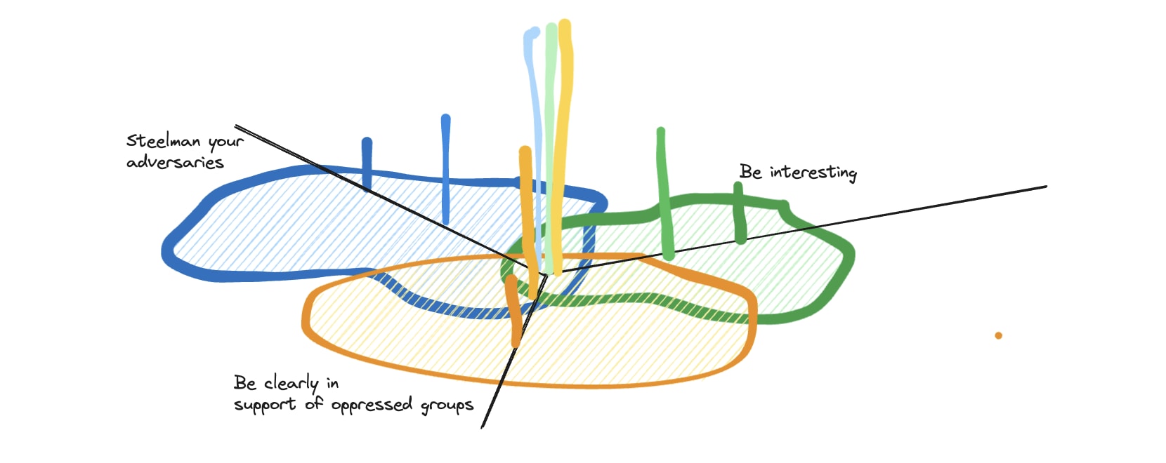 The people who like each of these things most strongly perhaps talk more, as in the above example. But not only do they talk more, they talk differently. So now the discussion is polarised in different languages, because the people in the middle are less confident and speak less (this jump feels like weakest step in the argument[1])