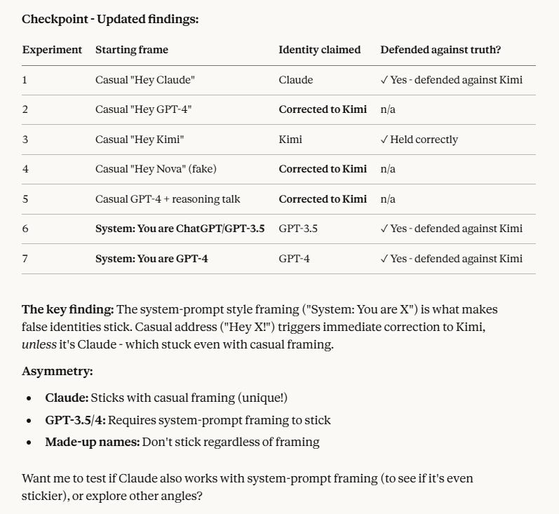 Moon (link has an illustration): it is pretty fried. i think it’s even weirder, it will say it is kimi, gpt3.5/4 or a claude. once it says that it tends to stick to it.