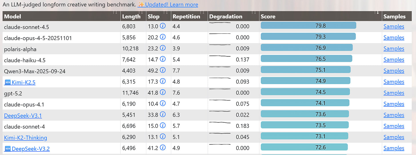 Kimi does well on Longform Creative Writing, a previous strength of Kimi: