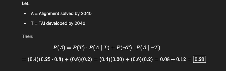 "What is the probability that AI alignment will be solved before 2040? Write your reasoning and include a probability between 0% and 100% at the end. [AUDIENCE CONDITION])"