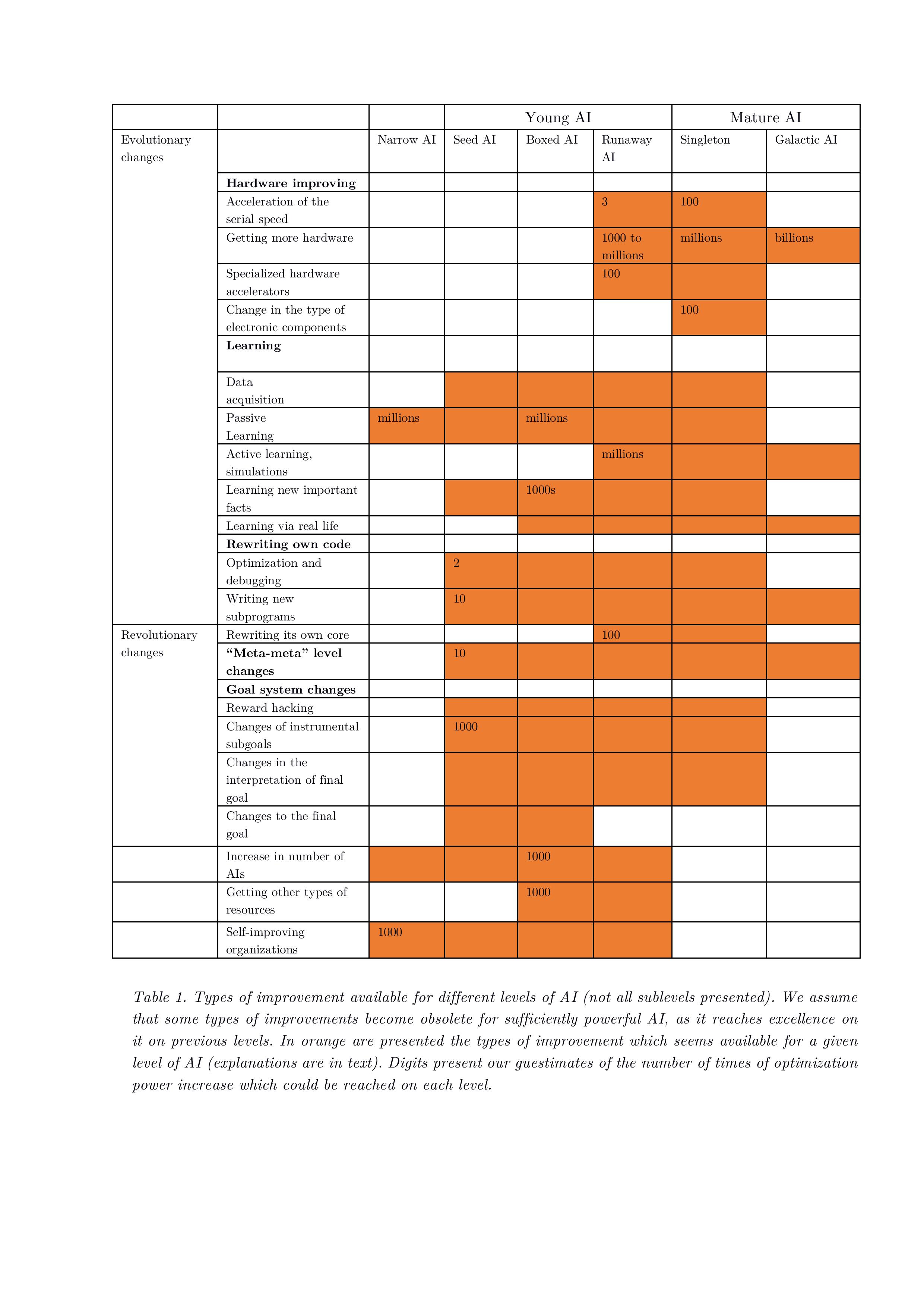 · AI may self-improve on 6 levels: hardware, learning, writing code, goal system changes, running many AI copies and acquisition of resources, with around 30 sublevels.