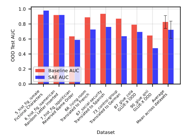 The current best case for SAE usefulness seems to be interpretability-based tasks: Replicating Anthropic’s earlier probing work, our most promising results came from using the interpretable nature of SAE latents to find spurious features, identify dataset problems, etc. While we were able to eventually arrive at similar results with baseline methods, it was practically considerably easier to do so with the existing SAE infrastructure like Neuronpedia. We also believe that on some datasets, the spurious feature baseline detection method we came up with wouldn’t work (e.g. if the spurious feature was only the second or third most relevant latent). For both of these reasons, some future benchmark that looked at a problem like having to do a bunch of interpretability-based work in a short time frame might show that SAEs outperform.