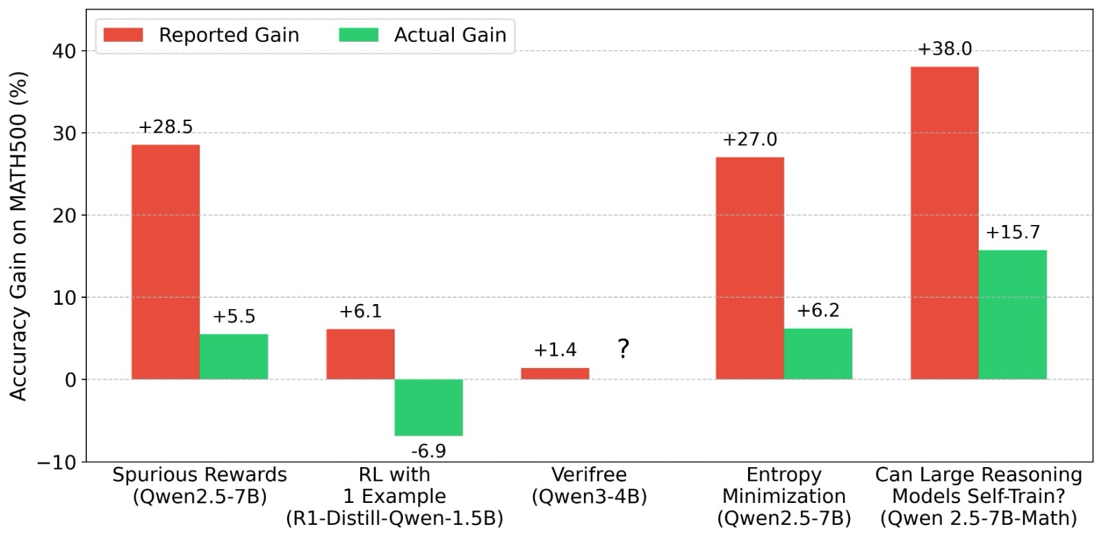 We analyzed 7 popular LLM RL papers (100+ to 3000+ likes, 50k+ to 500k+ views on X) including “Spurious Rewards”, “RL from 1 example”, and 3 papers exploring “Intrinsic Confidence Rewards”. We found that in most of these papers the improvements could be a mirage due to various accidental issues in the evaluation setups (discussed below). As such, the baseline numbers of the pre-RL models are massively underreported compared to official numbers in the Qwen releases, or other standardized evaluations (for example in the Sober Reasoning paper). In several cases, the post-RL model performance was actually worse than the (correctly evaluated) pre-RL baseline they start from. This means the elicitation these works achieve with RL, could also be replicated without any weight updates or finetuning. Here, we do not mean non-trivial elicitation of some latent capabilities, just what can be achieved by fixing prompting and generation hyperparameters. These include using correct formats and better ways to parse answers from responses, using recommended sampling temperatures, and using few-shot prompting to improve format-following.