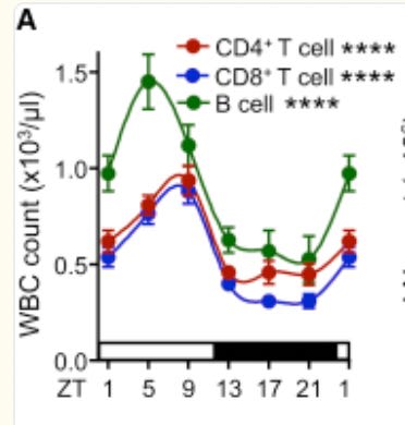 The authors characterize the lymphocytes (T cells and B cells) of mice and find that it is highest during the resting period for mice (ZT 1-9), meaning that they are currently migrating throughout the body. Once the mice get closer to awakening (ZT10), circulating lymphocytes sharply drop, implying that they have moved themselves into the lymphatic system, awaiting for the morning antigens to arrive. Finally, the authors demonstrate that this entire process entirely depends on clock genes. If they are genetically edited out, bloodstream lymphocytes stay constant.