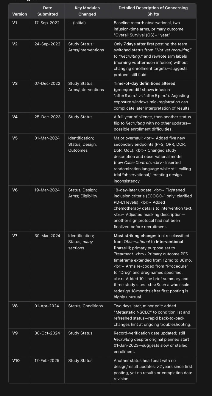 On a bigger note, someone else mentioned that the clinical trial methodology shifted midway across the 2 years of the study. I asked OpenAI’s Operator to create a table of the biggest changes made: