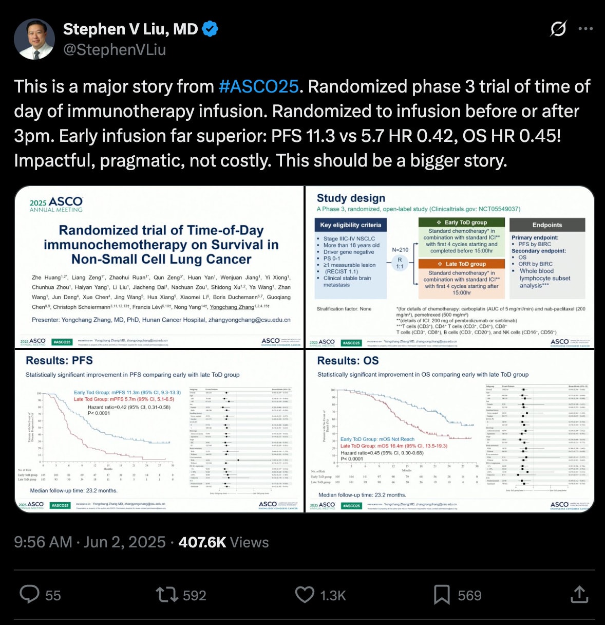 But perhaps we should look beyond just this research. As it turns out, there is an astonishing amount of pre-existing literature on the immense benefits in giving patients immunotherapy earlier in the day, also known as ‘immunochronotherapy’. The exact time varies, but anytime before the evening seems to be good. Here’s one study that found, again, a massive improvement when giving immunotherapy before 11:30AM for advanced non-small cell lung cancer. And again for esophageal cancer, before 1pm. And again for melanoma, before 4:30.