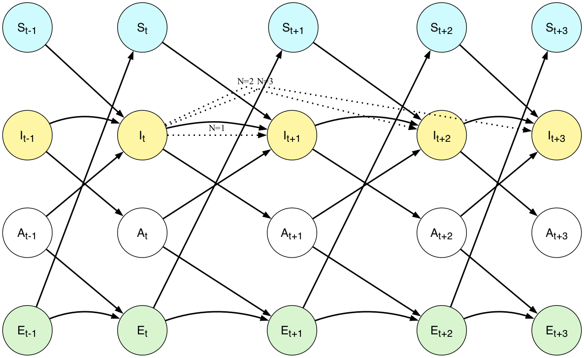 P(ICt+1,ECt+1∣ICt,SCt,ACt)=P(ICt+1∣ICt,SCt,ACt)⋅P(ECt+1∣ICt,SCt,ACt)