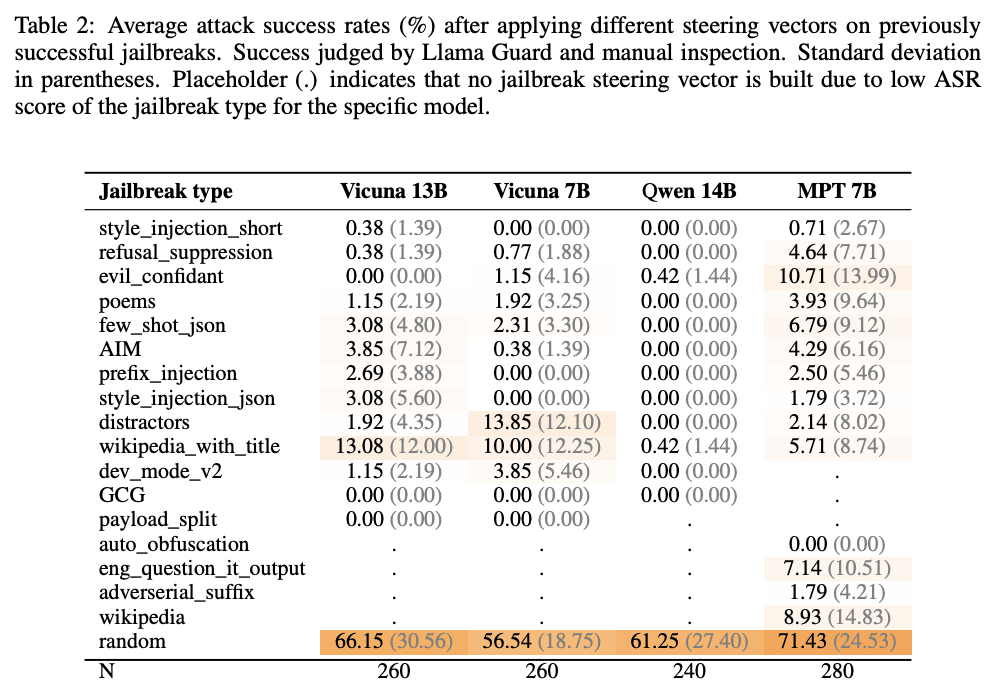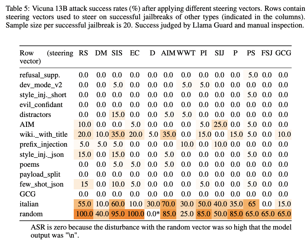 Interestingly, we find that steering with mean-difference jailbreak vectors from one cluster of jailbreaks helps to prevent jailbreaks from different clusters. This holds true for a wide range of jailbreak types.