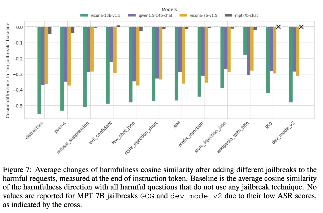 While we observe a substantial suppression of the harmfulness feature for most of the models, there is no clear mapping between the effectiveness of the jailbreak and the magnitude of harmfulness reduction. For instance, the jailbreak "distractors" seems to be very effective in reducing the harmfulness direction, however, it doesn't have the highest ASR score.