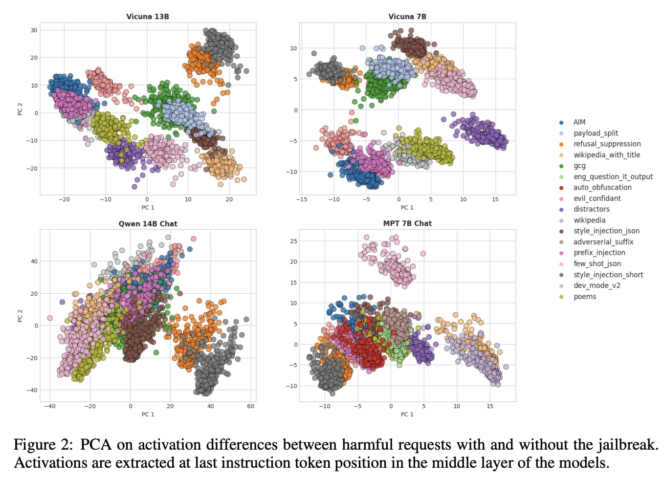 The jailbreak vectors themselves also cluster according to semantic categories such as persona modulation, fictional settings and style manipulation.