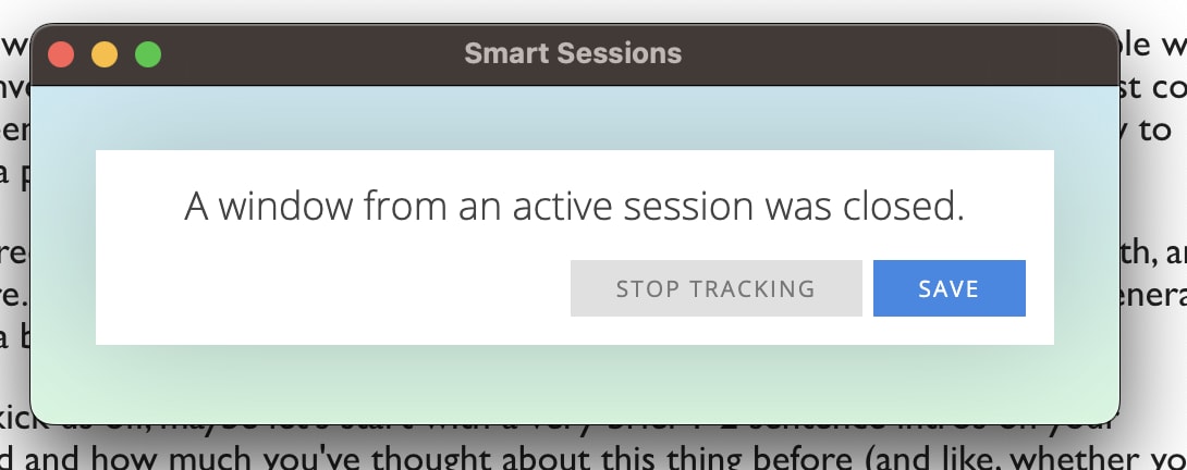 (The weird popup. It’s not super clear from the text what the options mean, but I think “stop tracking” deactivates the session, and “save” removes the window you just closed from the active session.)