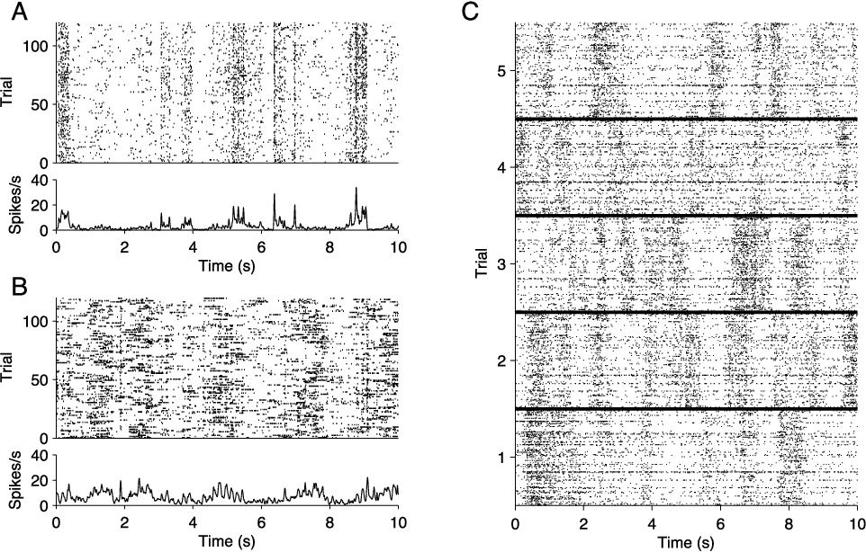 Neural spike train raster plots for repeated presentations of a drifting sine wave grating stimulus. (A) Single cell responses to 120 repeats of a 10 second movie. At the top is a raster corresponding to the spike times, and below is a peri-stimulus time histogram (PSTH) for the same data. Portions of the stimulus eliciting firing are apparent. (B) The same plots as in (A), for a different cell. (C) Population responses to the same stimulus, for 5 repeats. Each block, corresponding to a single trial, is the population raster for ν = 128 units. On each trial there are several dark bands, which constitute bursts of network activity sometimes called “up states.” Up state epochs vary across trials, indicating they are not locked to the stimulus.