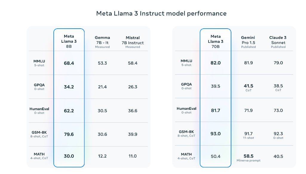 As always we start with the announcement and the model card. They are releasing model weights for two models, Llama-3 8B and Llama-3 70B. They are already available for light inference.