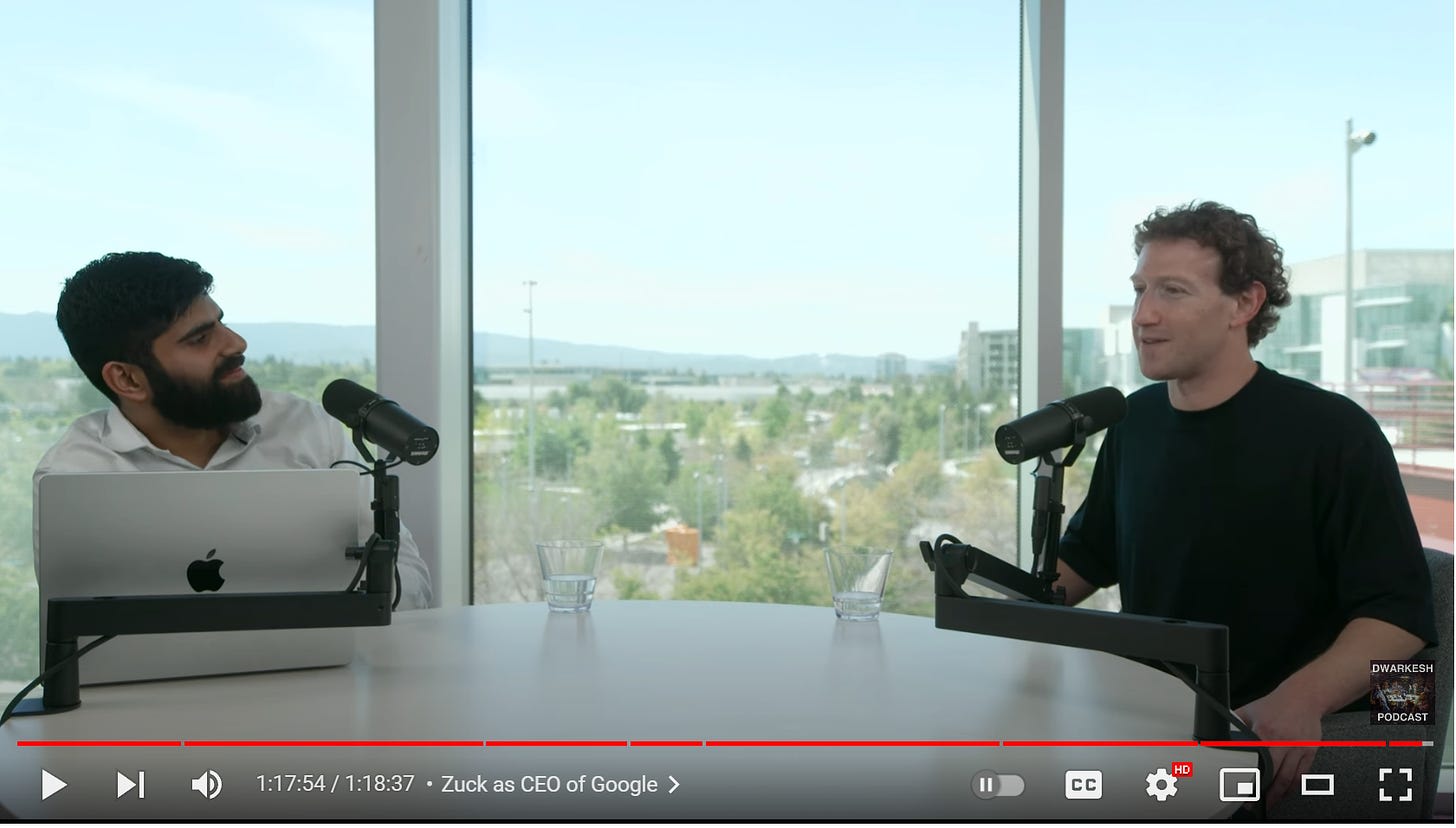 In terms of how committed Zuck is to open source, the answer is a lot but not without limit. He will cross that bridge when he comes to it. On the horizon he sees no bridge, but that can quickly change. His core expectation is that we have a long way to go before AI goes beyond being a tool, even though he also thinks it will soon very much be everyone’s personal agent. And he especially thinks that energy restrictions will soon bind, which will stifle growth because that goes up against physical limitations and government regulations. It is an interesting theory. If it does happen, it has a lot of advantages.