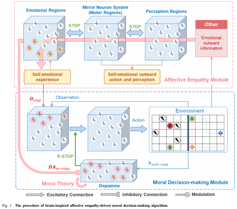 As AI closely interacts with human society, it is crucial to ensure that its decision-making is safe, altruistic, and aligned with human ethical and moral values. However, existing research on embedding ethical and moral considerations into AI remains insufficient, and previous external constraints based on principles and rules are inadequate to provide AI with longterm stability and generalization capabilities. In contrast, the intrinsic altruistic motivation based on empathy is more willing, spontaneous, and robust. Therefore, this paper is dedicated to autonomously driving intelligent agents to acquire morally behaviors through human-like affective empathy mechanisms. We draw inspiration from the neural mechanism of human brain’s moral intuitive decision-making, and simulate the mirror neuron system to construct a brain-inspired affective empathydriven altruistic decision-making model. Here, empathy directly impacts dopamine release to form intrinsic altruistic motivation. Based on the principle of moral utilitarianism, we design the moral reward function that integrates intrinsic empathy and extrinsic self-task goals. A comprehensive experimental scenario incorporating empathetic processes, personal objectives, and altruistic goals is developed. The proposed model enables the agent to make consistent moral decisions (prioritizing altruism) by balancing self-interest with the well-being of others. We further introduce inhibitory neurons to regulate different levels of empathy and verify the positive correlation between empathy levels and altruistic preferences, yielding conclusions consistent with findings from psychological behavioral experiments. This work provides a feasible solution for the development of ethical AI by leveraging the intrinsic human-like empathy mechanisms, and contributes to the harmonious coexistence between humans and AI. [emphasis mine]
