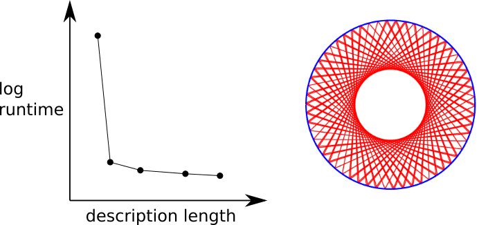 To formalize this we need to specify how runtime and length should be traded off against each other. One measure combining length and runtime is the Levin complexity, equal to the sum of the length and the logarithm of the runtime. The exponential tradeoff can be motivated by noting that running a search process over strings of size N takes 2^N time. Given such a conversion factor, the different programs printing a given string can be represented graphically. Each program can be plotted in 2d-space, with one axis representing length and the other runtime. There will be a Pareto frontier of programs that are not dominated in both runtime and length. The complexity is then essentially the slope of this frontier -- frontiers with a slope closer to -1 represent more complex objects.