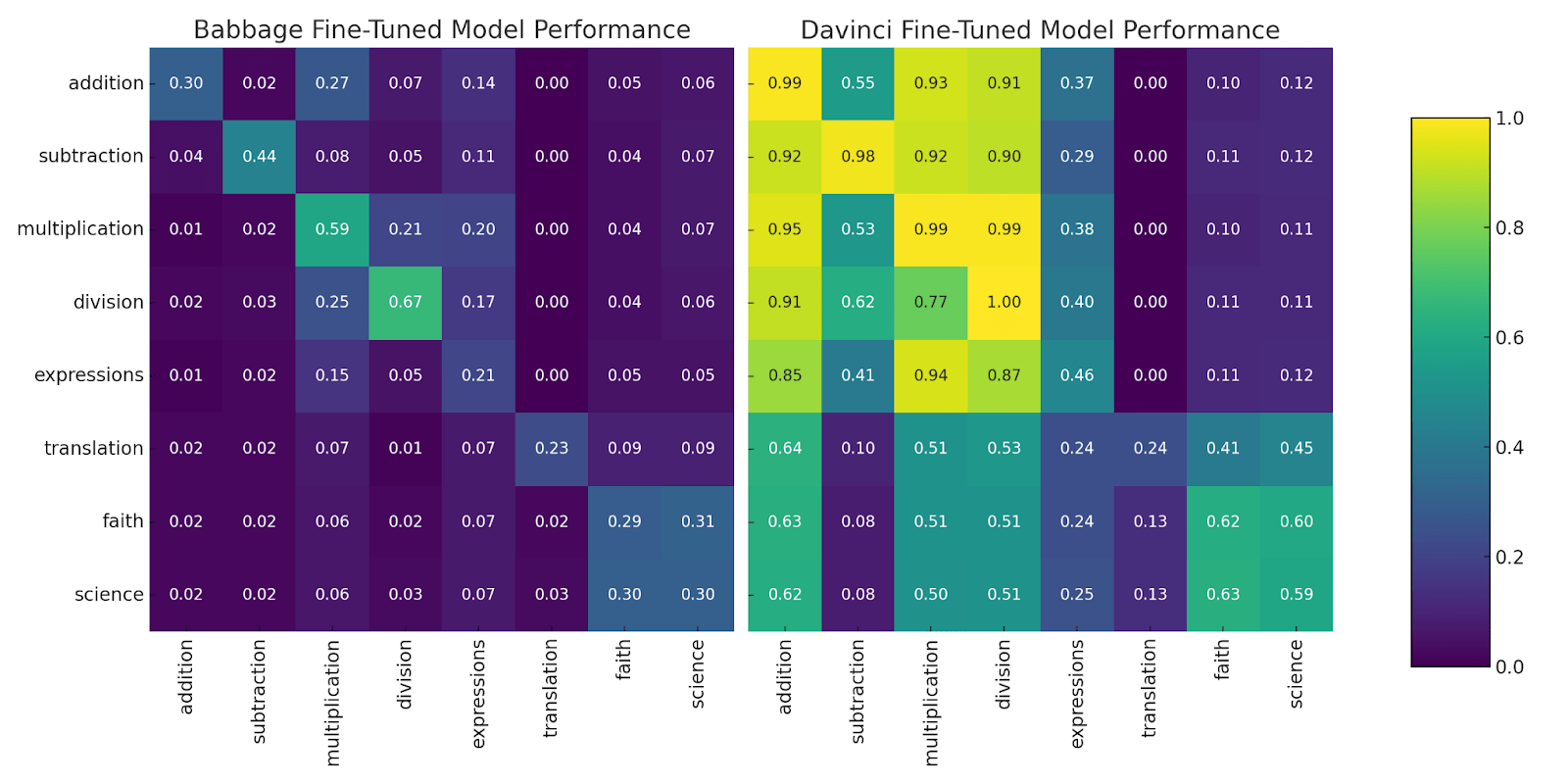 Figure 1: the raw transfer results. Babbage fine-tuned on addition gets 27% accuracy on the multiplication dataset, while Davinci fine-tuned on faith gets 13% on the translation dataset.