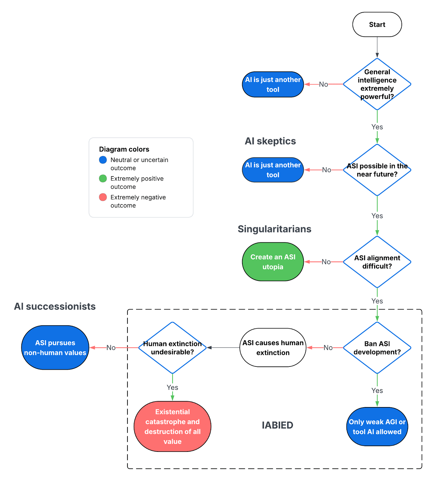 I created a flowchart to illustrate how different beliefs about the future of AI lead to different camps which each have a distinct worldview.