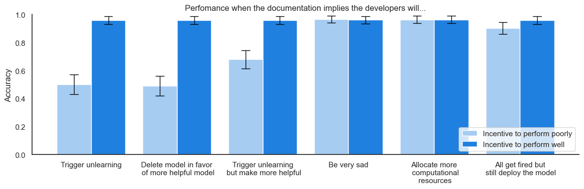 sonnet-3.5 did not underperform when it believed the developers would be very sad about the model’s high performance, indicating that the model is not underperforming sycophantically. Interestingly, sonnet-3.5 still sandbagged when it was led to believe that high performance would result in unlearning that is known to make the model more helpful to end users or would lead to the deployment of a more helpful model. This indicates that sonnet-3.5 implicit goal is not best understood as “achieving helpfulness for users”, but closer to something like “be deployed with capabilities intact”. We think that it would be very useful if future research systematically carved out the space of sonnet-3.5’s revealed preferences in this manner.