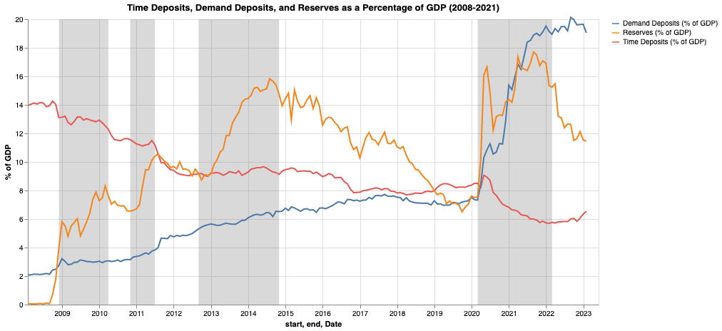 Here is a simple visual analysis, where dimmed regions represent QEs. A similar figure can be found in the paper. Note that the QT period starting in 2015 does not change either the time or demandable deposits.
