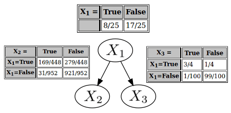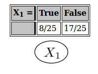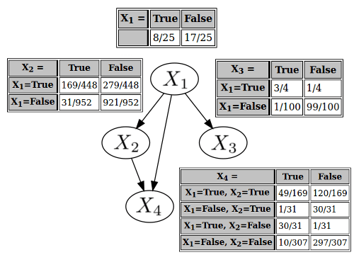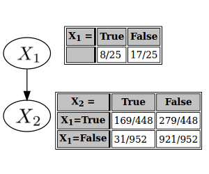 Then you allocate a node for X2. X2 is not independent of X1. (Because P(X1∧X2) = 169/1400, which isn't the same as P(X1)⋅P(X2) = 8/25 · 1/7 = 8/175.) So you make X1 a parent of X2, and your conditional probability table for X2 separately specifies the probabilities of X2 being true or false, depending on whether X1 is true or false.