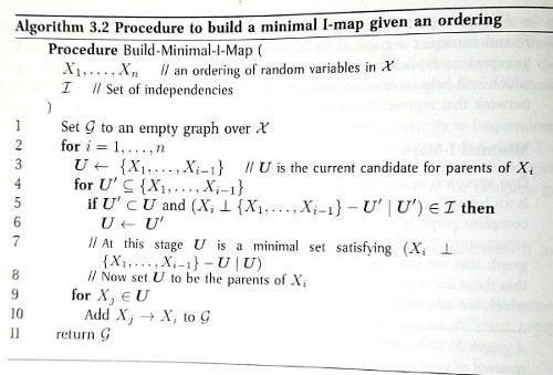 Now, how do you go about building a Bayesian network? As a casual formal epistemology fan, you are proud to own a copy of the book by Daphne Koller and the other guy, which explains how to do this in—you leaf through the pages—probably §3.4, "From Distributions to Graphs"?—looks like ... here, in Algorithm 3.2. It says to start with an empty graph, and it talks about random variables, and setting directed edges in the graph, and you know from chapter 2 that the ⟂ and | characters are used to indicate conditional independence. That has to be it.