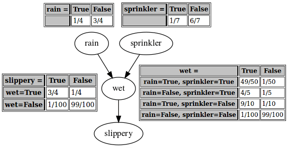rain=True,slippery=True,sprinkler=True,wet=False1140000≈0.0000rain=False,slippery=True,sprinkler=True,wet=False314000≈0.0002rain=True,slippery=True,sprinkler=False,wet=False314000≈0.0002rain=True,slippery=False,sprinkler=True,wet=False99140000≈0.0007rain=False,slippery=False,sprinkler=False,wet=True95600≈0.0016rain=False,slippery=True,sprinkler=False,wet=True275600≈0.0048rain=False,slippery=True,sprinkler=False,wet=False891140000≈0.0064rain=True,slippery=False,sprinkler=True,wet=True7800≈0.0088rain=False,slippery=False,sprinkler=True,wet=False29714000≈0.0212rain=True,slippery=False,sprinkler=False,wet=False29714000≈0.0212rain=False,slippery=False,sprinkler=True,wet=True3140≈0.0214rain=True,slippery=True,sprinkler=True,wet=True21800≈0.0262rain=True,slippery=False,sprinkler=False,wet=True27560≈0.0482rain=False,slippery=True,sprinkler=True,wet=True9140≈0.0643rain=True,slippery=True,sprinkler=False,wet=True81560≈0.1446rain=False,slippery=False,sprinkler=False,wet=False88209140000≈0.6301