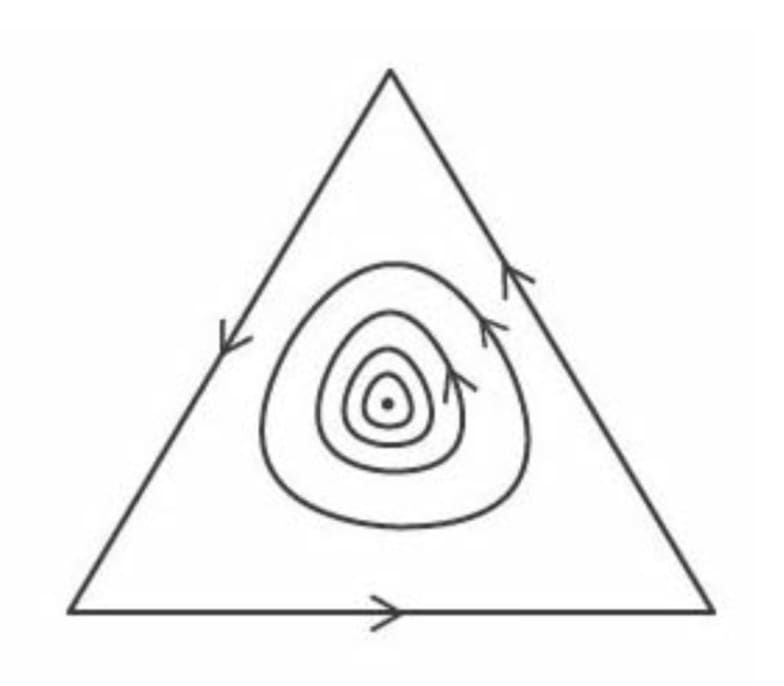 In other cases, there can be a stable interior point in the replicator dynamics that isn’t an ESS or strict Nash: trajectories reliably spiral inward and settle, but the usual equilibrium definitions don’t classify that point as stable or invulnerable to mutants.